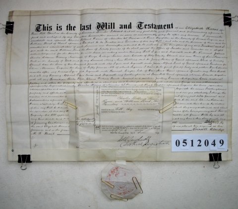 | Parchment : Copy of Will on 1 sheet 40cm x 59cm with grant of probate on second smaller sheet. The pendant seal has been folded and cracked across the middle. | |||||||||||