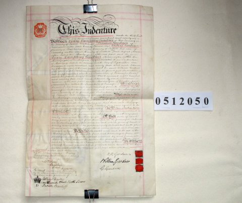 | Parchment : 2 sheets 45cm x 30cm with 3 wax seals, 3 signatures and revenue stamp. The Indenture is written on 1 side only with a large plan of the property across the 2 sides in the middle. | ||||||||||||||