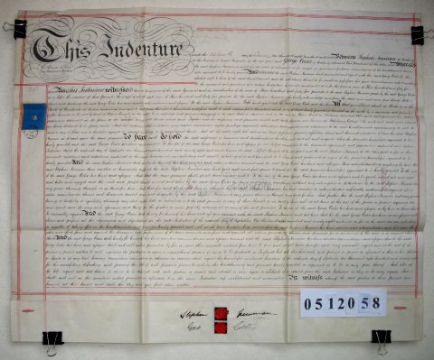 | Parchment : 1 sheet 55cm x 69cm with 2 wax seals, 2 signatures, revenue stamp and a small plan f the property on the back | |||||||||||||