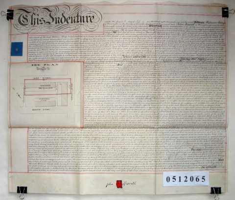 | Parchment : 1 sheet 61cm x 70cm with 1 wax seal, signature and revenuestamp. Includes a plan othe property in the margin. | ||||||||||||
