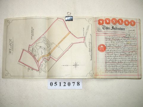 | Parchment : 7 pages (written on 14 sides) 27cm x 21cm, plus large plan of the property 41cm x 27cm. 6 wax seals, signatures and revenue stamps. | ||||||||||||