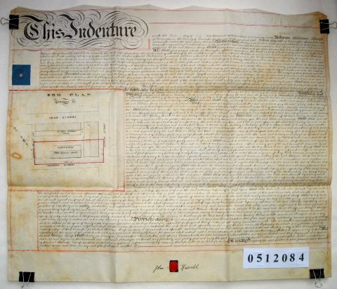 | Parchment : 1 sheet 60cm x 71cm with 1 wax seal, 1 signature, revenue stamp and plan of the property. | ||||||||||||