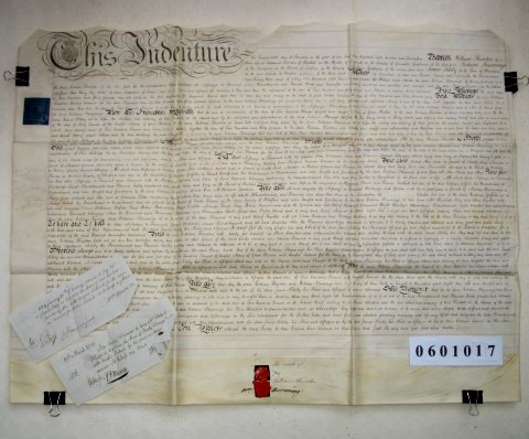 | Parchment : 1 sheet 61cm x 70cm with 2 wax seals, 2 signatures and revenue stamp. Two paper promissory notes are attached. | |||||||||||