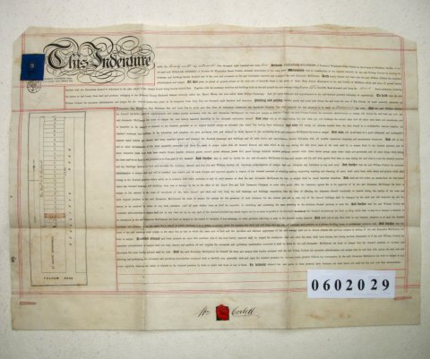 | Parchment : 1 sheet 49cm x 68cm printed with 1 wax seal, signature, revenue stamp and plan of the property. | |||||||||||