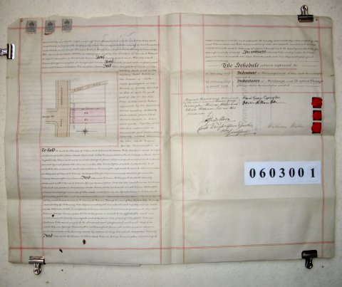 | Parchment : 2 sheets 47cm x 31cm with 3 wax seals, 3 signatures, revenue stamps and plan of the property | ||||||||||||
