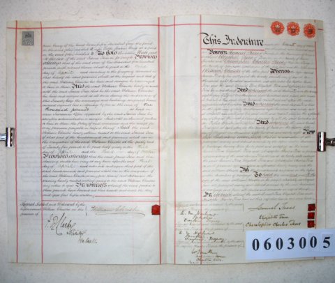 | Parchment : 2 sheets 37cm x 25cm with 4 wax seals, 4 signatures and revenue stamps. A second indenture of 1902 has been added later. | ||||||||||||