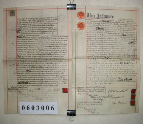 | Parchment : 2 pages 40cm x 26cm with 4 wax seals, 4 signatures and revenue stamps. A second Indenture of 1908 had been added at the end. | |||||||||||