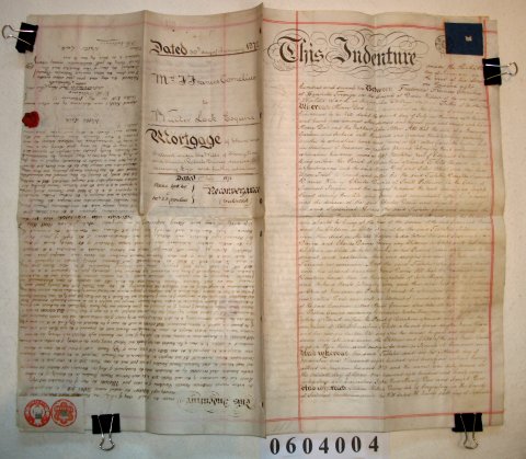 | Parchment : 4 sheets, closely written, 47cm x 30cm with 1 wax seal, signature and revenue stamp. A second Indenture of 1878 has been added on the back. | ||||||||||||