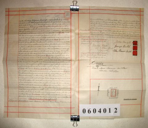 | Parchment : 2 sheets 41cm x 26cm with 3 wax seals, 3 signatures and revenue stamps. Includes a small plan of the property. | |||||||||||||