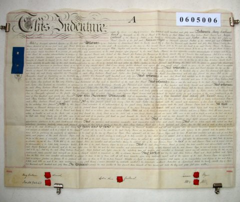 | Parchment : 1 sheet 59cm x 77cm with 5 wax seals, 5 signatures and revenue stamps | |||||||||||