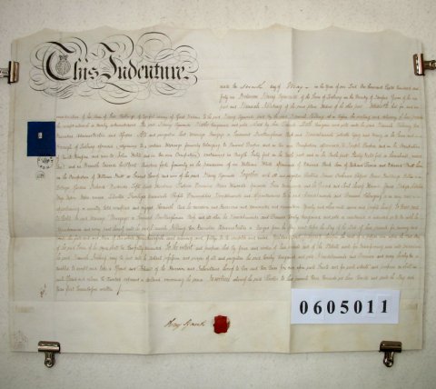 | Parchment : 1 sheet 44cm x 56cm with 1 wax seal, signature and revenue stamp | |||||||||||
