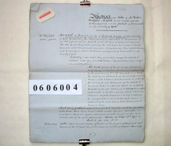 William Wright NORFOLK of Dunkerswick, Yorkshire. Farmer. Rev Aaron MANLEY of Knaresborough, Yorkshire. Martin MOORE of Weeton, Parish of Harewood, Yorkshire. Farmer. James HARRISON of Adel, Yorkshire. Schoolmaster. Isaac MOORE of Weeton, Parish of Harewood, Yorkshire. Farmer. SUBJECT The document is headed 'Abstract of the Title of Mr William Wright Norfolk to an Estate at Dunkerswick in the Parish of Harewood in the County of York'. It describes events from 1793 to 1855 relating to land belonging primarily to Martin Moore and his descendants. It begins in 1793 with Enclosure Commissioners awarding various pieces of common land in the Parish of Harewood to Martin Moore and John Moore. Martin Moore left it to his two sons, Martin and John, who agreed to divide it between them. Martin left his portion to his two sons, Ralph and Isaac, while John left his to his niece, Sarah Harrison, the wife of James Harrison. Many other names appear as having held mortgages on the property at various times - notably Aaron Manley and his descendants and William Norfolk. | |||||||||||