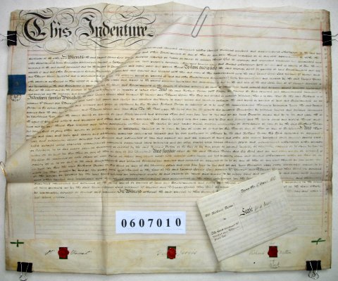 | Parchment : LEASE - 1 sheet 40cm x 56cm with 1 wax seal, signature and revenue stamp. RELEASE - 2 sheets 59cm x 71cm with 3 wax seals, 3 signatures, revenue stamps, and large plan of the property on the reverse of second sheet | |||||||||||||