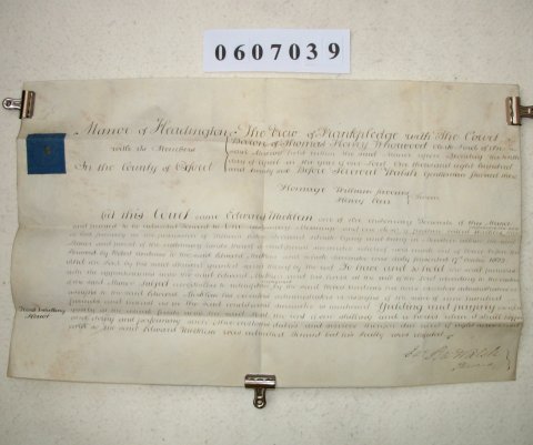 | Parchment : 1 sheet 32cm x 51cm with revenue stamp and signature of the Steward of the Manor. | |||||||||||