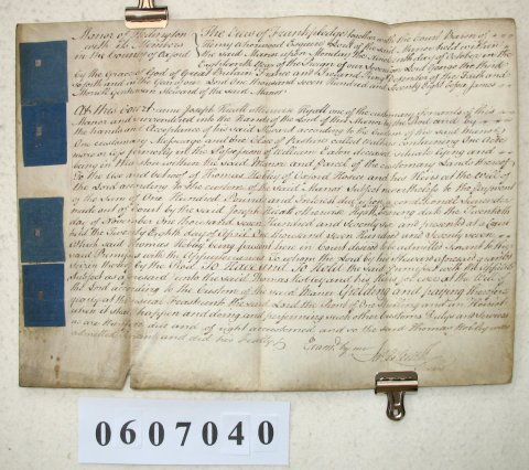 Joseph HYATT of Hedington, Oxford, Oxfordshire. Thomas HOBLEY of Oxford. Oxfordshire. Hosier. James MORRELL of Hedington, Oxfordshire. Steward of the Manor. SUBJECT This document is a record of the Court Baron and View of Frankpledge of the Manor of Hedington. Joseph Hyatt is mortgaging copyhold property in the manor to Thomas Hobley for £100. Accordingly, Joseph Hyatt is surrendering the property to the Lord of the Manor and Thomas Hobley is being admitted to it. The property consists of a messuage with a close of land called Walkers containing 1 acre. | |||||||||||