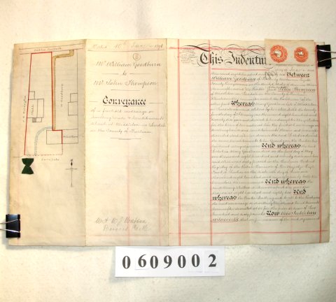 | Parchment: 2 sheets 29cm x 23cm with 1 wax seal, signature and revenue stamps. Includes a plan of the property on the back. | |||||||||||