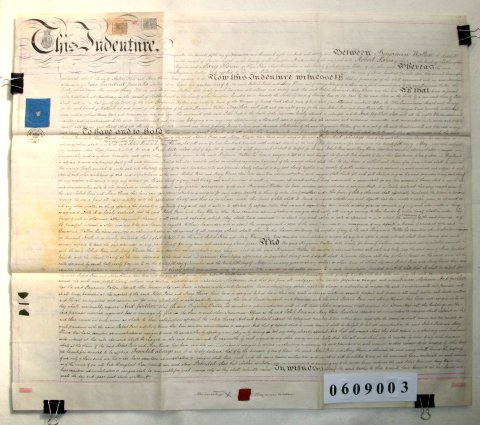 | Parchment : 1 sheet 73cm x 62cm with a second indenture of 1885 written on the back. A total of 3 wax seals and signatures and revenue stamps | |||||||||||||
