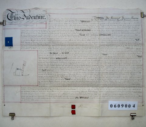 | Parchment : 1 sheet 56cm x 74cm with 2 wax seals, 1 signature, revenue stamp and plan of the property | |||||||||||