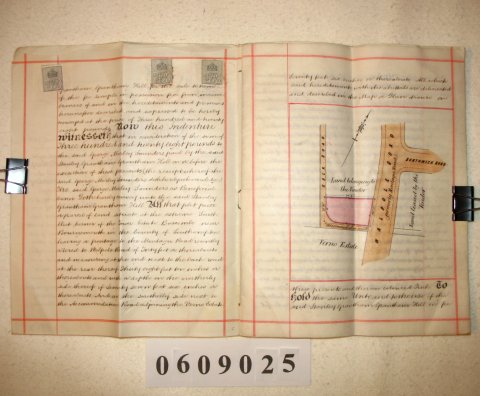 | Parchment : 4 pages 26cm x 21cm plus cover sheet and with plan of the property. This labelled and stamped as a "Duplicate Coneyance" and the signatures have been torn out of the final page | |||||||||||