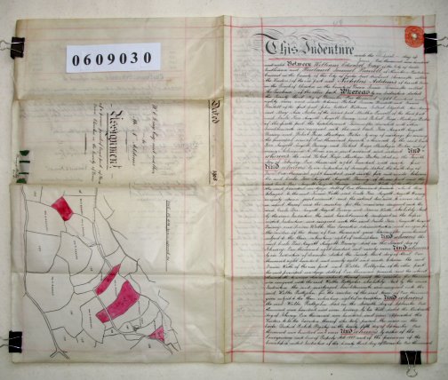 | Parchment : 2 sheets 54cm x 34cm with 3 wax seals, 3 signatures, revenue stamp and large plan of the property on the back cover. | ||||||||||||