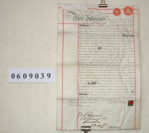 | Parchment : 2 sheets 40 cm x 26cm (written on one side of one sheet only) with one wax seal, signature and revenue stamp. | ||||||||||||||