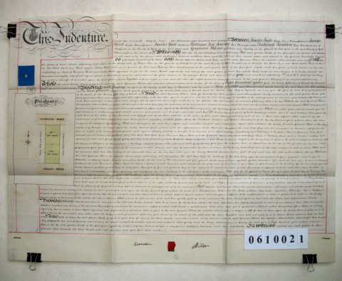 | Parchment : 1 sheet 58cm x 76cm with 1 wax seal, signature, revenue stamp and outline plan of the property. | |||||||||||
