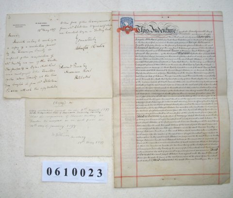 | Parchment : 2 sheets 40cm x 26cm with 4 wax seals, 4 signatures and revenue stamps. There are two pieces of correspondence on paper attached. | ||||||||||||
