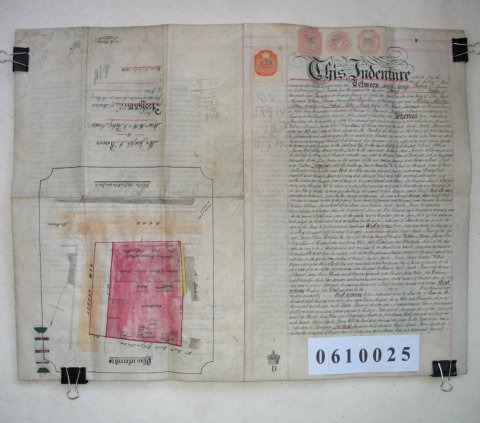 | Parchment : 2 sheets 45cm x 30cm with 4 wax seals, 4 signatures, revenue stamps and plan of the property. | |||||||||||||
