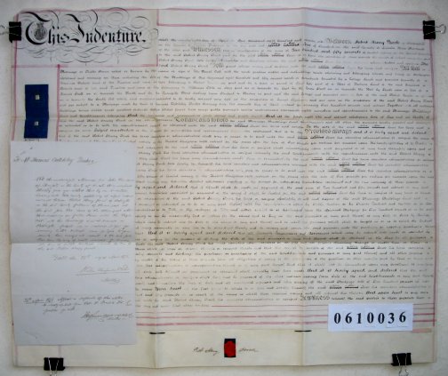 | Parchment : 1 sheet 60cm x 73cm with 1 wax seal, signature and revenue stamps. A separate paper letter is attached. | |||||||||||