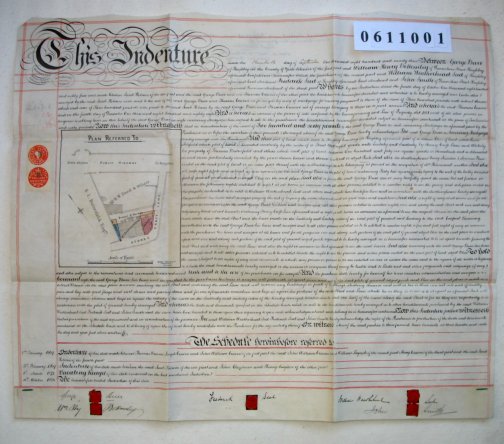 | Parchment : 1 sheet 60cm x 72cm with 5 wax seals, 5 signatures, revenue stamps and plan of the property. | |||||||||||