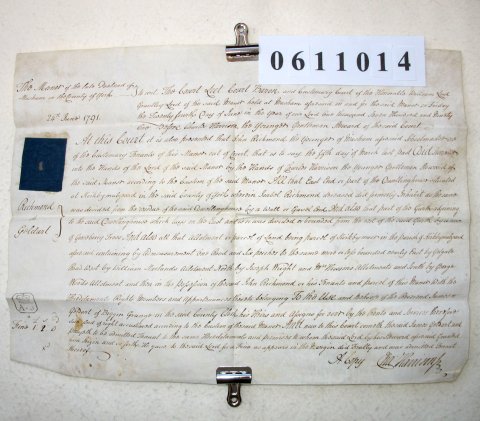 John RICHMOND (the younger) of Masham, Yorkshire. Schoolmaster. The Rev James GOLDART of Biggin Grange, Yorkshire. Charles HARRISON Steward of the Manor of Masham, Yorkshire. SUBJECT This document is a record of the Court Baron of the Manor of Masham, Yorkshire, in which John Richmond is selling copyhold property in the Manor to the Rev James Goldart. The property consists of the East End of a dwellinghouse in Kirkbymabye together with part of the adjoining garth and also an allotment of 1 rood in Kirkby Moor. It was recently inhabited by Isabel Richmond (now deceased). As is usual for such property, John Richmond first surrenders it to the Lord of the Manor, after which the Rev Goldart is admitted to it. | |||||||||||