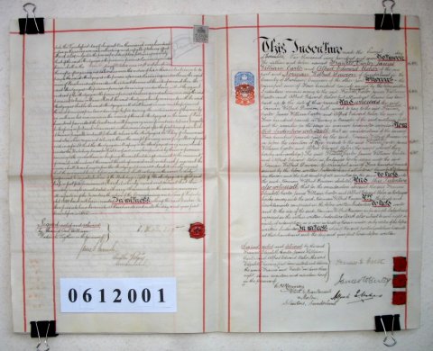 | Parchment : 2 sheets 40cm x 26cm (written closely on 3 sides) with 4 wax seals, 4 signatures and revenue stamps. A second Indenture of 1907 has been written on the third page. | ||||||||||||