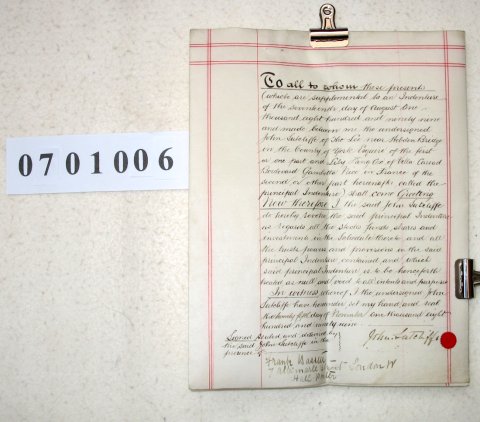 John Sutcliffe of The Lee near Hebden Bridge, Yorkshire. Esquire. SUBJECT This is a deed poll in which John Sutcliffe is revoking an earlier deed made 17.08/1899. Little information is given about the earlier deed except that it involved "stocks, funds, shares and investments" and had been made with Lily King Cox whose address was in Nice, France. | ||||||||||||