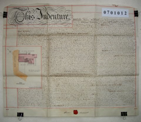 | Parchment : 1 sheet 58cm x 72cm with 1 red wax seal, signature of Amon Anscombe, and plan of the property. | ||||||||||||