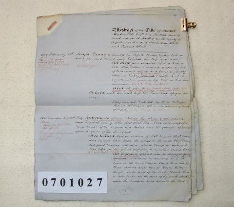 Joseph DENNY of Lowestoft, Suffolk. Vinter. John ELPH of Lowestoft, Suffolk. Liquor Merchant. Sarah Ann WHITE of Lowestoft, Suffolk. Spinster. Harriet WHITE of Lowestoft, Suffolk. Spinster. Samuel Morton PETO. of Lowestoft, Suffolk. SUBJECT The document relates to a small piece of land of slightly more than 1 acre in the Parish of Kirkley, Suffolk. It begins in 1809 when Joseph Denny died leaving it to his wife Elizabeth. In 1811 she sold it to John Elph for £88. Then in 1838 John Elph left it to Sarah and Harriet White, who were nieces of Sarah Elph, his late wife. Finally, in 1849, these two sold it to Samuel Peto for £250. The document is not dated but the most recent event listed occurred on 22 November 1849 and the paper is watermarked 1853. Presumably, it was written shortly after that date. It is a draft which contains many amendments and corrections. | ||||||||||