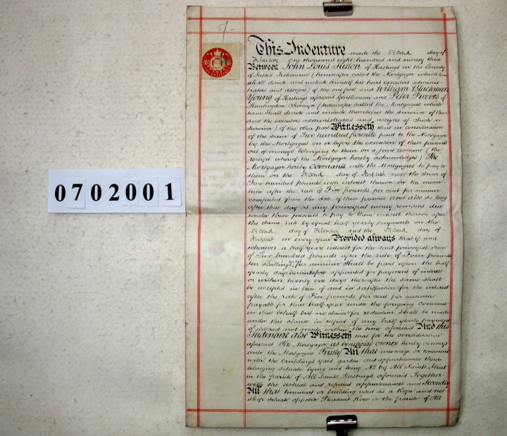 John Louis SUTTON of Hastings, Sussex. (Fisherman) William Blackman YOUNG of Hastings, Sussex. (Gentleman) Peter PURVES of Huntingdon, Huntingdonshire. (Surveyor) SUBJECT John Sutton is mortgaging property in Hastings, Sussex, to William Young and Peter Purves for £200. It consists of 1) a dwellinghouse at number 69 All Saints Street, Hastings, and 2) a Rope and Net Shop opposite Pleasant Row in the Parish of All Saints, Hastings. We are told that the Rope and Net Shop came into the hands of John Sutton in 1871. | ||||||||||||