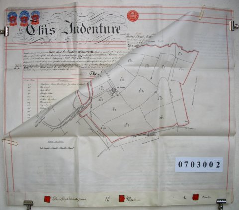 | Parchment : 2 sheets 60cm x 71cm with 3 wax seals, 3 signatures and revenue stamp. The second sheet is devoted to a plan of the property. | ||||||||||||
