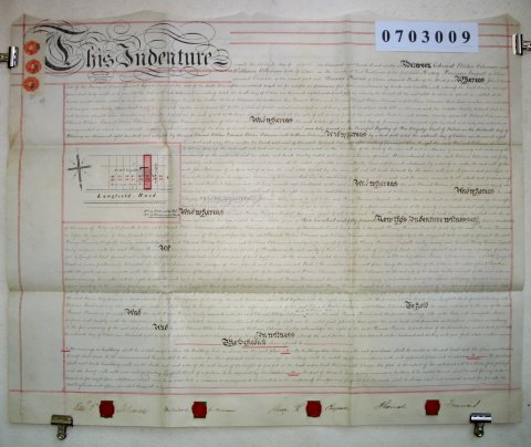| Parchment : 1 sheet 59cm x 72cm with 4 wax seals, 4 signatures, revenue stamps and small plan. | |||||||||||