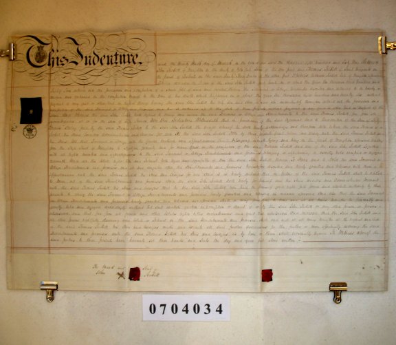 | Parchment : 1 sheet, 66cm x 55cm, Revenue Stamp, signed X the mark of John Pickett against red wax seal | |||||||||||