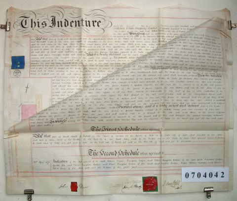 | Parchment : 2 sheets 59cm x 71cm with 3 wax seals, signatures, revenue stamps and a small plan of the property. A second indenture of 1873 has been added on the back of the second sheet. | |||||||||||