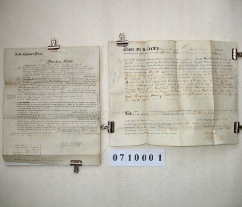 The property is in the parish of Sunderland, Durham, and was either sold or mortgaged on 5 December 1851. The document was sworn before Two of the perpetual Commissioners appointed for taking the acknowledgments of Deeds by Married Women in Holmfirth, Yorkshire. | ||||||||||||