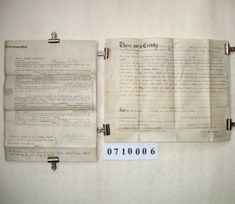 | This ORIGINAL document is a standard certificate which arises from the sale or mortgage of property which had belonged to a married woman. At this period (ie after 1833 but prior to the Married Women's Property Act of 1882) any property of a married woman passed immediately to her husband. As some sort of safeguard she would be examined by a commissioner appointed for the purpose who would satisfy himself that she was of full age and understood what was going on. The document is signed by the commissioner, but not by either the husband or wife. It gives the parish in which the property is located and date of the transaction, but no further detail. | ||||||||||||||