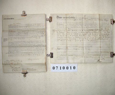 | This ORIGINAL document is a standard certificate which arises from the sale or mortgage of property which had belonged to a married woman. At this period (ie after 1833 but prior to the Married Women's Property Act of 1882) any property of a married woman passed immediately to her husband. As some sort of safeguard she would be examined by a commissioner appointed for the purpose who would satisfy himself that she was of full age and understood what was going on. The document is signed by the commissioner, but not by either the husband or wife. It gives the parish in which the property is located and date of the transaction, but no further detail. | ||||||||||||||
