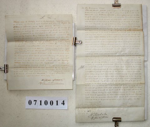 | This ORIGINAL document is a standard certificate which arises from the sale or mortgage of property which had belonged to a married woman. At this period (ie after 1833 but prior to the Married Women's Property Act of 1882) any property of a married woman passed immediately to her husband. As some sort of safeguard she would be examined by a commissioner appointed for the purpose who would satisfy himself that she was of full age and understood what was going on. The document is signed by the commissioner, but not by either the husband or wife. It gives the parish in which the property is located and date of the transaction, but no further detail. | ||||||||||||||
