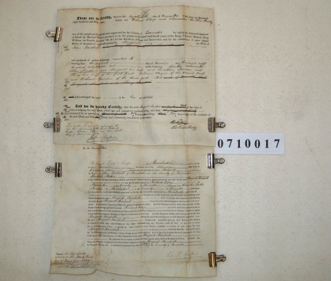 | This ORIGINAL document is a standard certificate which arises from the sale or mortgage of property which had belonged to a married woman. At this period (ie after 1833 but prior to the Married Women's Property Act of 1882) any property of a married woman passed immediately to her husband. As some sort of safeguard she would be examined by a commissioner appointed for the purpose who would satisfy himself that she was of full age and understood what was going on. The document is signed by the commissioner, but not by either the husband or wife. It gives the parish in which the property is located and date of the transaction, but no further detail. | ||||||||||||||