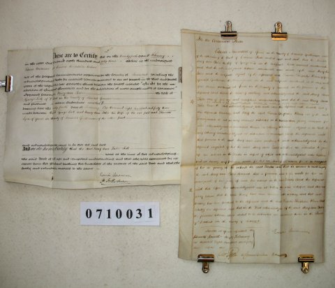 | This ORIGINAL document is a standard certificate which arises from the sale or mortgage of property which had belonged to a married woman. At this period (ie after 1833 but prior to the Married Women's Property Act of 1882) any property of a married woman passed immediately to her husband. As some sort of safeguard she would be examined by a commissioner appointed for the purpose who would satisfy himself that she was of full age and understood what was going on. The document is signed by the commissioner, but not by either the husband or wife. It gives the parish in which the property is located and date of the transaction, but no further detail. | ||||||||||||||