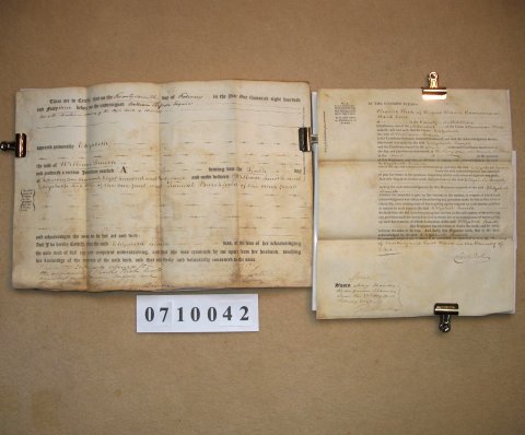 | This ORIGINAL document is a standard certificate which arises from the sale or mortgage of property which had belonged to a married woman. At this period (ie after 1833 but prior to the Married Women's Property Act of 1882) any property of a married woman passed immediately to her husband. As some sort of safeguard she would be examined by a commissioner appointed for the purpose who would satisfy himself that she was of full age and understood what was going on. The document is signed by the commissioner, but not by either the husband or wife. It gives the parish in which the property is located and date of the transaction, but no further detail. | ||||||||||||||