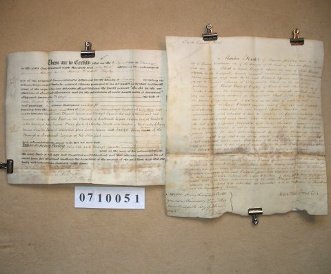 | This ORIGINAL document is a standard certificate which arises from the sale or mortgage of property which had belonged to a married woman. At this period (ie after 1833 but prior to the Married Women's Property Act of 1882) any property of a married woman passed immediately to her husband. As some sort of safeguard she would be examined by a commissioner appointed for the purpose who would satisfy himself that she was of full age and understood what was going on. The document is signed by the commissioner, but not by either the husband or wife. It gives the parish in which the property is located and date of the transaction, but no further detail. | ||||||||||||||