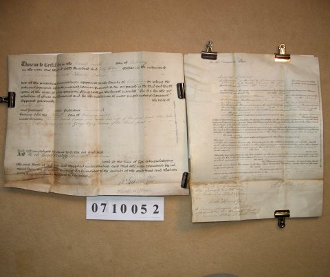 | This ORIGINAL document is a standard certificate which arises from the sale or mortgage of property which had belonged to a married woman. At this period (ie after 1833 but prior to the Married Women's Property Act of 1882) any property of a married woman passed immediately to her husband. As some sort of safeguard she would be examined by a commissioner appointed for the purpose who would satisfy himself that she was of full age and understood what was going on. The document is signed by the commissioner, but not by either the husband or wife. It gives the parish in which the property is located and date of the transaction, but no further detail. | ||||||||||||||