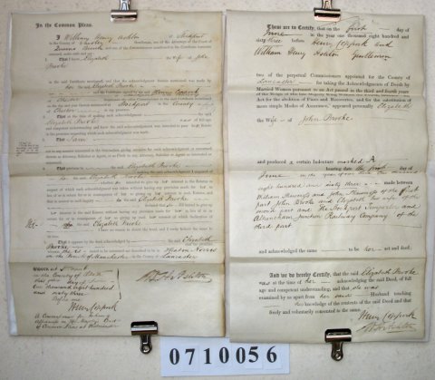 The property is in Heaton Norris, in the Parish of Manchester, County of Lancaster, and was either sold or mortgaged on 1 June 1865. The document was sworn before Two of the perpetual Commissioners appointed for taking the acknowledgments of Deeds by Married Women in Stockport, Cheshire.. | ||||||||||||